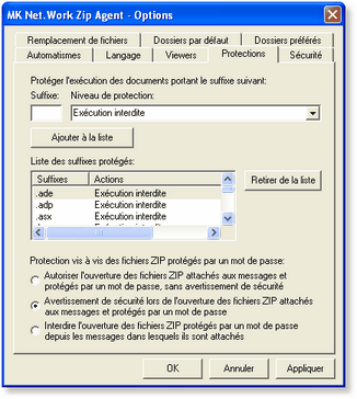 ZipAgent dispose également de fonctions de protection vis à vis de la visualisation ou de l'exécution par les utilisateurs de fichiers compressés potentiellement à risque vis à vis de leur système (.exe, .bat, .com etc...). Ces fonctions de protection configurables permettent d'éviter le lancement accidentel de ces fichiers par les utilisateurs.